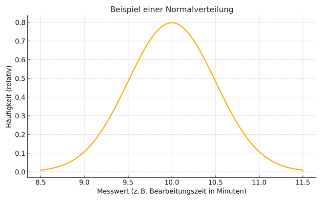 Ein anschauliches Beispiel für eine Normalverteilung: Stellen Sie sich vor, Sie messen die Zeit, die Mitarbeiter für das Verpacken eines Produkts benötigen. Einige sind schneller, andere etwas langsamer, aber die meisten liegen nah am Durchschnitt. Solche Datenreihen sind oft normalverteilt – die Zeiten für einzelne Verpackungsaufträge schwanken symmetrisch um die mittlere Bearbeitungszeit herum.