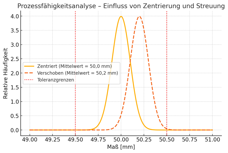 Dieses Beispiel zeigt, wie wichtig es ist, Streuung und Zentrierung im Blick zu behalten. Ein Prozess kann präzise, aber schlecht zentriert sein – und dadurch trotzdem Ausschuss produzieren. Umgekehrt hilft auch eine perfekte Zentrierung wenig, wenn die Streuung zu groß ist. Die Prozessfähigkeitsanalyse macht beides sichtbar und gibt eine klare, objektive Grundlage für Verbesserungsmaßnahmen.